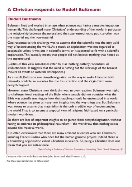 This resource presents a Christian response to the theological ideas of Rudolf Bultmann, a significant figure in modern biblical criticism. The document examines Bultmann’s views on demythologisation and the implications for understanding Christian faith. By engaging with this response, students can explore the intersections of faith and critical scholarship, fostering discussions about the relevance of traditional beliefs in contemporary theological discourse. This document serves as a valuable tool for educators in religious studies.