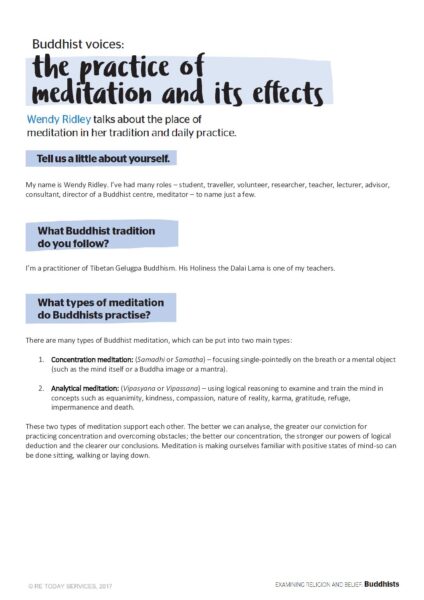 This document offers a longer version of Wendy’s interview, focusing on her experiences with meditation and its role in her Buddhist practice. The interview provides insights into the significance of meditation in fostering mindfulness and spiritual growth. By engaging with Wendy’s reflections, students can gain a deeper understanding of Buddhist teachings and the practical applications of meditation in everyday life. This resource encourages discussions about the importance of personal experiences in understanding religious practices, making it a valuable tool for educators in religious education.