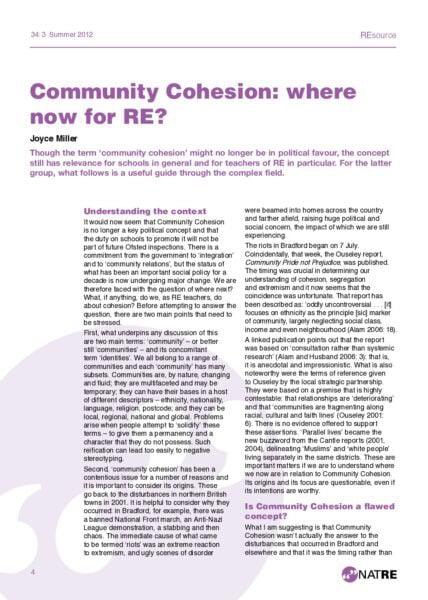 ìCommunity Cohesion: Where Now for RE? î examines the role of Religious Education in promoting community cohesion in a diverse society. This resource discusses strategies for RE to foster understanding, tolerance, and unity, especially in multicultural settings. It provides insights for educators on how RE can address social cohesion, exploring themes of shared values and respect across belief systems. This guide is suitable for educators looking to enhance RE ís impact on social harmony and community building, providing a roadmap for integrating community cohesion into RE curricula.