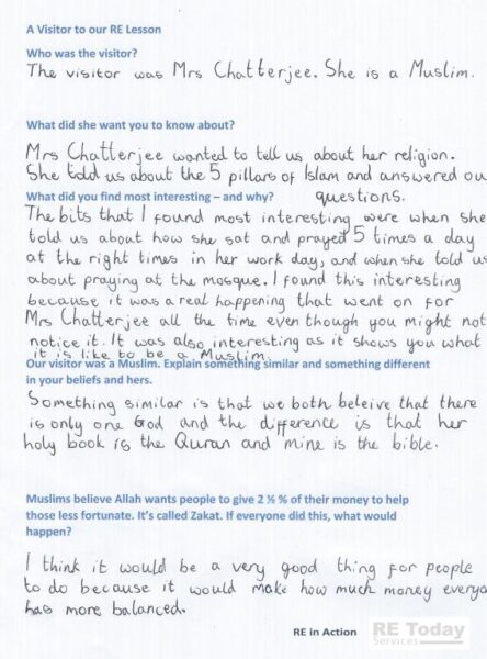 “Example of Work: Living as a Muslim” shares insights from a student ís interaction with a Muslim visitor. This work emphasizes firsthand learning about Islamic practices, cultural customs, and values, enriching students’ understanding of Muslim faith and fostering empathy and interfaith respect.