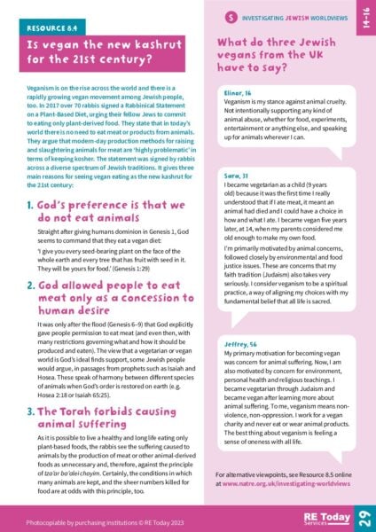 This document poses the question, “Is vegan the new kashrut for the 21st century?” It examines contemporary debates around veganism within the context of traditional Jewish dietary laws (kashrut). By exploring these discussions, students can reflect on the evolving nature of dietary practices in response to ethical and environmental considerations. This resource is valuable for educators discussing modern interpretations of religious teachings.
