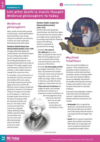 This resource provides insights into life after death in Jewish thought, tracing the views of medieval philosophers to contemporary beliefs. It discusses various interpretations and teachings related to the afterlife, encourages aging students to explore how these beliefs shape moral and ethical behaviour within the Jewish community. By engaging with this document, students can develop a deeper understanding of the relevance of these teachings in modern life, making it a valuable resource for educators.