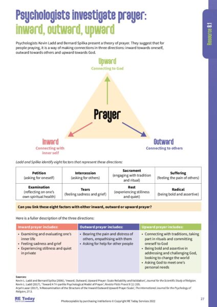 This resource investigates how psychologists investigate prayer, examining the psychological effects and benefits associated with prayer practices. It discusses findings from various studies on the impact of prayer on mental well-being and spirituality, prompting students to consider their own experiences with prayer. This document serves as a valuable tool for exploring the emotional dimensions of faith in religious education.