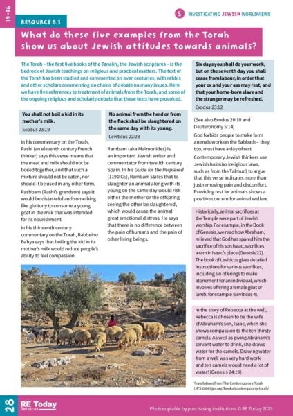 This resource investigates what five examples from the Torah reveal about Jewish attitudes towards animals. It encourages students to reflect on the moral implications of these teachings and how they inform contemporary views on animal rights and welfare within the Jewish community. By engaging with this material, students can develop a deeper understanding of the ethical dimensions of Jewish teachings.