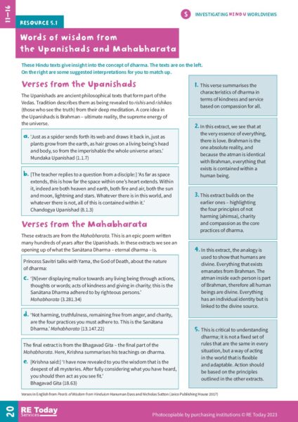 This document highlights wisdom from the Upanishads and Mahabharata, exploring their teachings and relevance in contemporary Hindu thought. It serves as a resource for educators to discuss important philosophical concepts within Hinduism, including ethics, duty, and the nature of reality, encourages aging students to engage with foundational texts that shape Hindu beliefs.